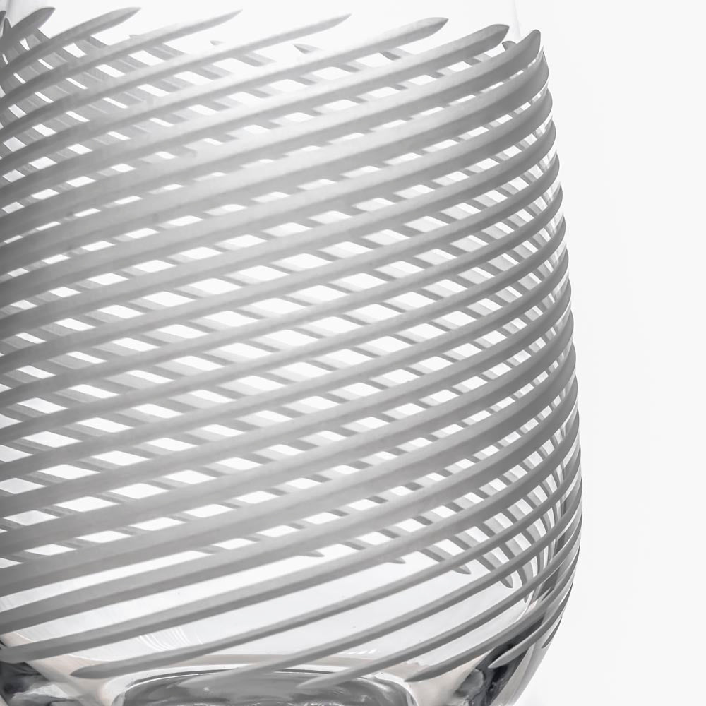 The Cyclone collection from Rolf Glass is modern, fun, bold and visually mesmerizing. Deeply engraved counterclockwise lines travel around the glass creating an illusion of cyclonic motion.